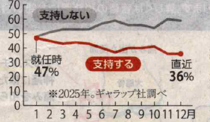 高市首相は人物や仕事ぶりへの支持率(人気)は高いようですが、政策として掲げる積極財政への市場の反応(円相場、長期金利)は警戒感が強いようです。また、外交面では日中関係は手詰まり状態にあり、その影響が顕在化しつつあります。
