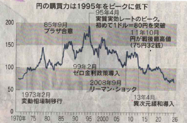 Prime Minister Takaichi mentioned during the House of Representative election campaign that she was “happy with the weak yen”, which was taken as if she were accepting the weak yen, and for a time, the yen was sold in the market. After that, it returned to the 153-yen level, but due to the joint U.S.-Israel military operation against Iran that began on February 28, the yen is being sold again. The yen was once considered a “safe-heaven currency that is bought during crises”, but it has now become the “weakest currency” in the world. Incidentally, the indicator showing the comprehensive strength of the yen has fallen to a new low since the shift to a floating exchange rate system (February 14, 1973), dropping to one-third of the peak level (31 years ago). The prolonged economic stagnation and low interest rates, referred to as the “lost 30 years” are the main factors.