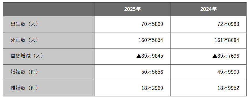 The number of children born in Japan in 2025 (including foreigners) was limited to 705,000, a 2.1% decrease from the previous year, marking the lowest number for 10 consecutive years. The declining birthrate is progressing 17 years faster than the country’s future projections, making the redesign of social security systems and other measures unavoidable. This year is the year of the fire horse, which occurs once every 60 years, and last time (in 1966) it decreased by 460,000 compared to the previous year, and the following year it increased by 580,000 (about 1.82 million→1.36 million →1.94 million), clearly showing the impact. At present, scientific technology has advanced and internationalization has also progressed, but considering that the number of people choosing to remain single for life is increasing, it seems that a decline in the future is inevitable.